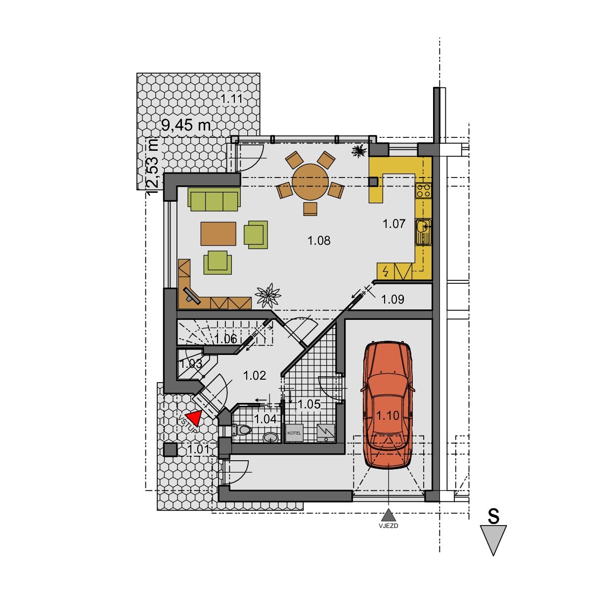 Vstup do domu a hlavní komunikační prostory jsou netradičně orientovány úhlopříčně, čímž vznikají zajímavé přechody mezi jednotlivými místnostmi. Kuchyň, jídelna a obývací pokoj jsou spojeny do veliké centrální obytné místnosti. ta je ještě rozšířena o prosklenou alkovnu vhodnou pro jídelní stůl, která obývací místnost příjemně prosluňuje. Dispozice počítá i s potřebnými pomocnými prostory – technická místnost, komora, spíž.